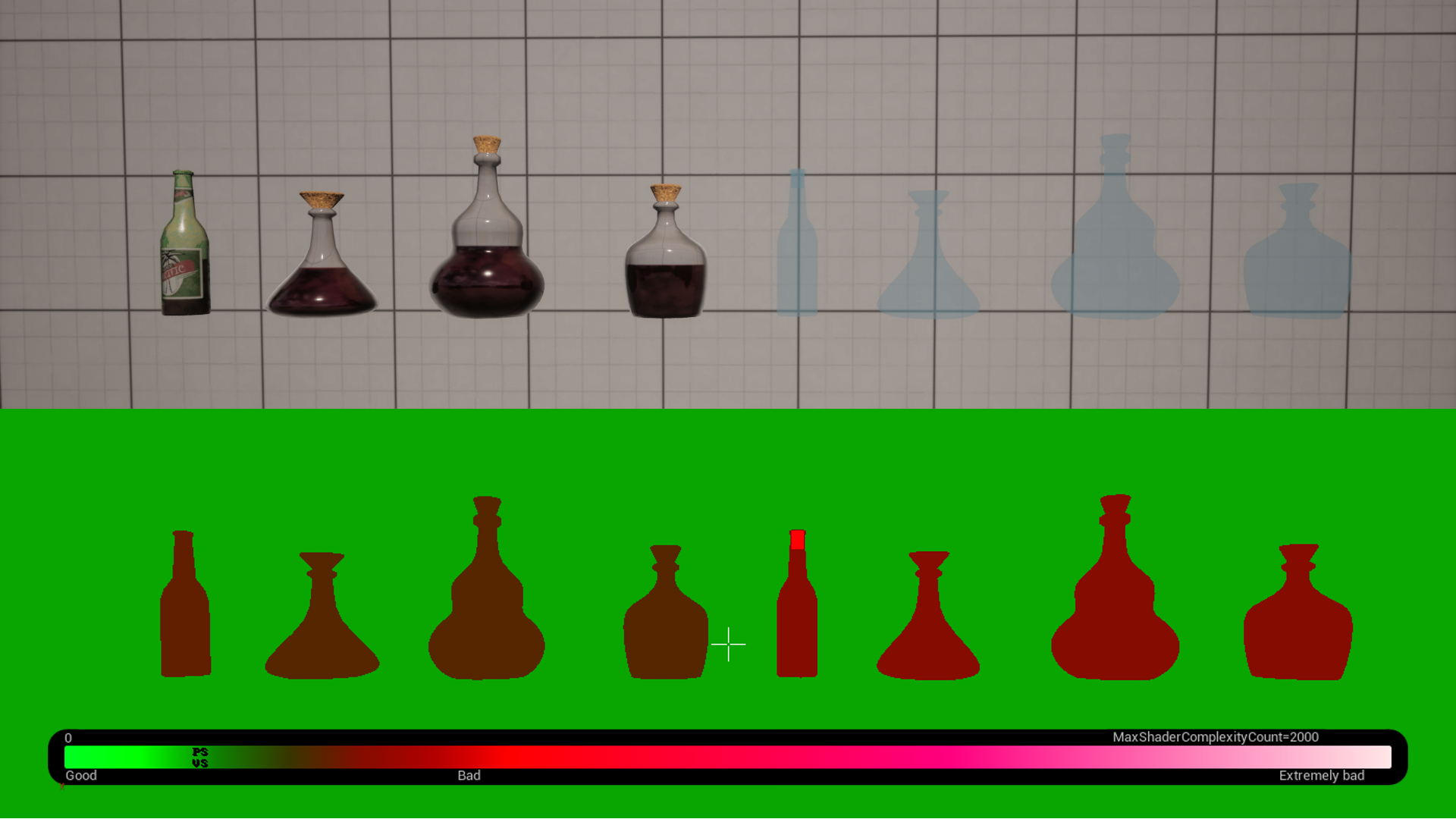 If we look at the shader complexity we can see that the material is somewhat expensive but still cheaper compared to translucency. The translucent material I am using in this comparison is the unreal default with just a color input plugged in.