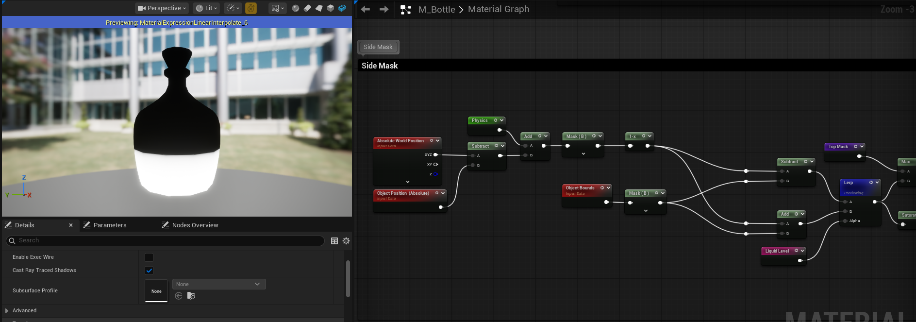 The side mask is a bit simpler. I get it by subtracting the object position from the world position which gives me the middle of the bottle. I want to lerp through a filled bottle and an empty bottle with my liquid controller so I adjust this mask with the help of the blue channel from the object bounds. I add it to one output of the lerp while subtracting it from the other to create the filled and empty versions.