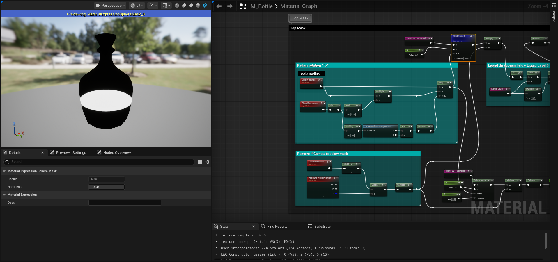 The central plane of the bottle is created using a modified version of the unreal "VirtualPlaneCoordinates" node which I have gone into and tweaked a bit to make the UVs it outputs scale to my preference. I later mask off the output with the help of a spheremask that gets it radius input from looking at the object bounds and rotation, making it fit the bottle.