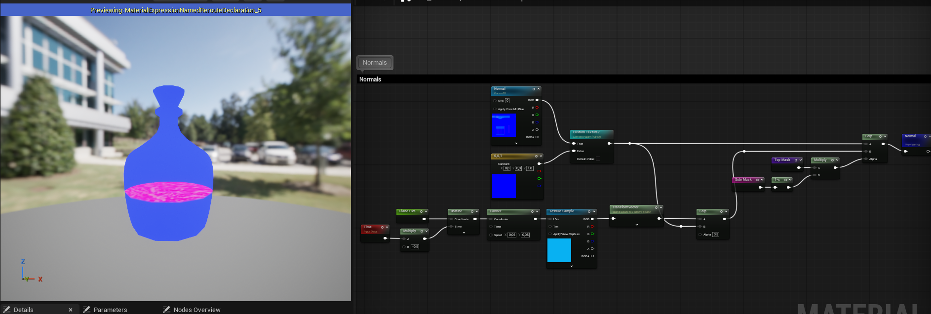 The normals are quite simple, for the central plane I use the UV output from the VirtualPlaneCoordinates node and add a texture of a water normal that is slightly panning and rotating. This is then lerped with the bottles normals to make it feel like the plane is inside of the bottle.