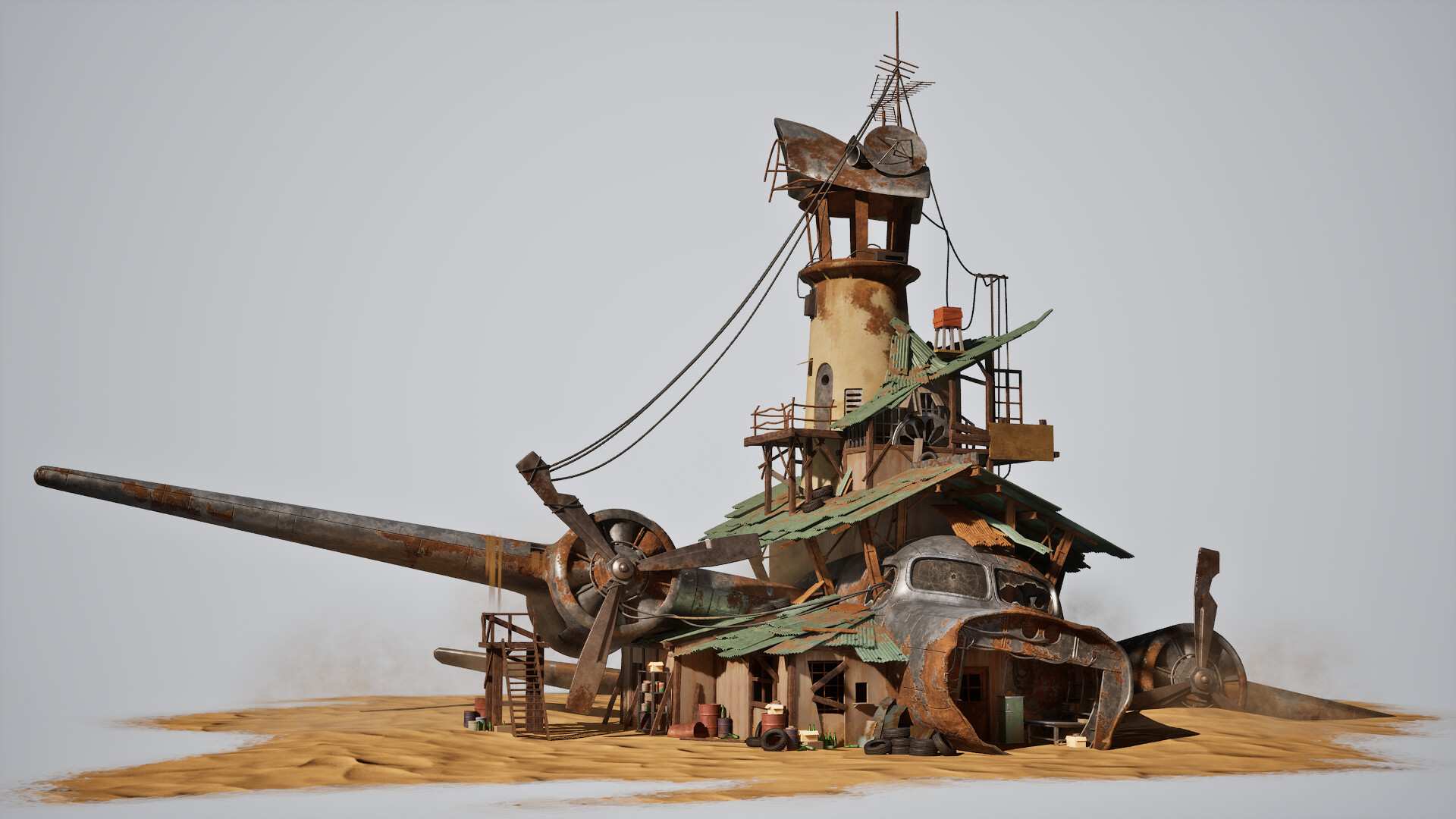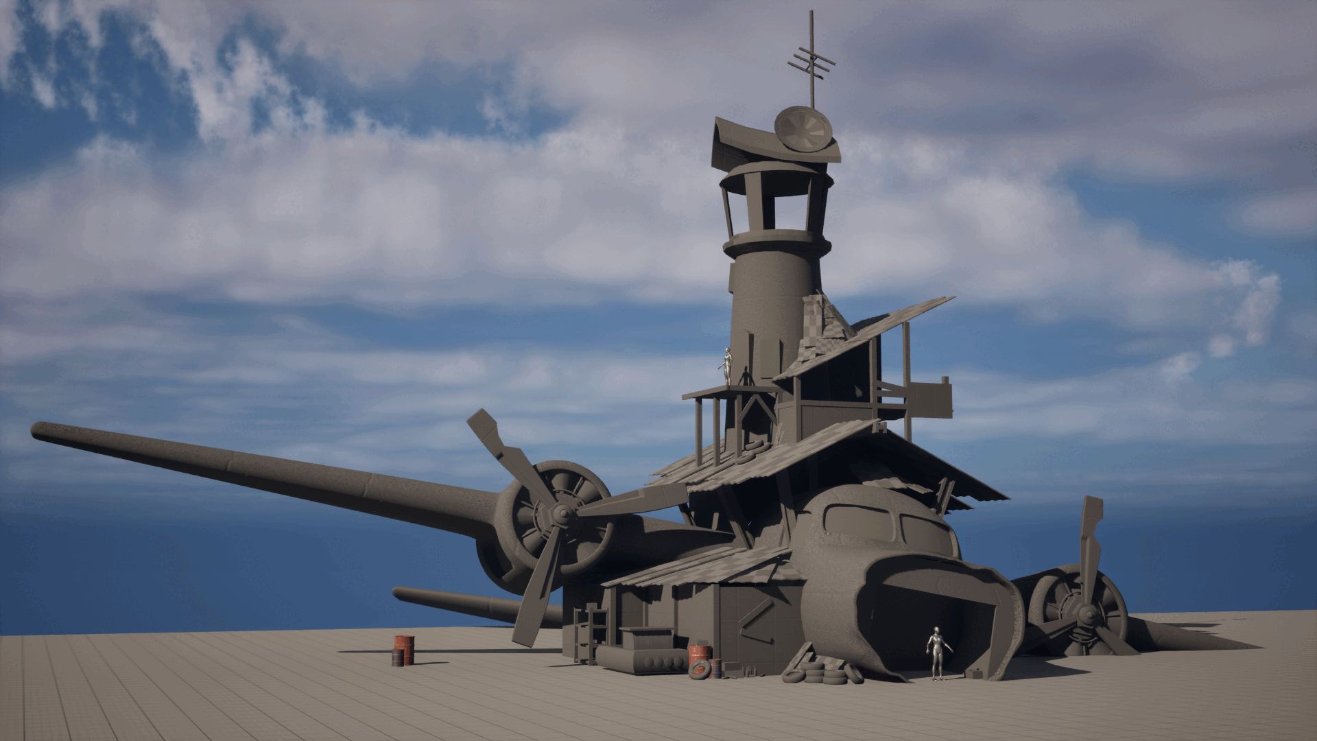 My last personal project while studying at PlaygroundSquad. Had a lot of fun tinkering with splat maps for the first time to get the rust / damage on the plane and tower. During the project I was unfortunately not able to add the car due to time constraints but I hope to revisit this project sometime in the future to add it!