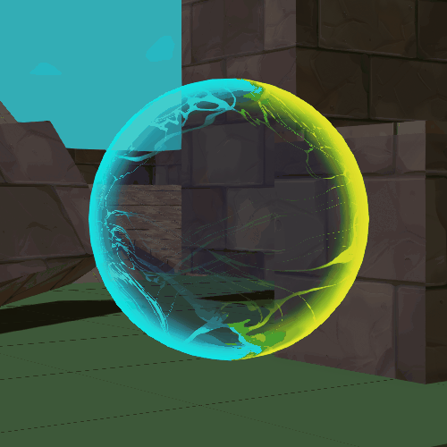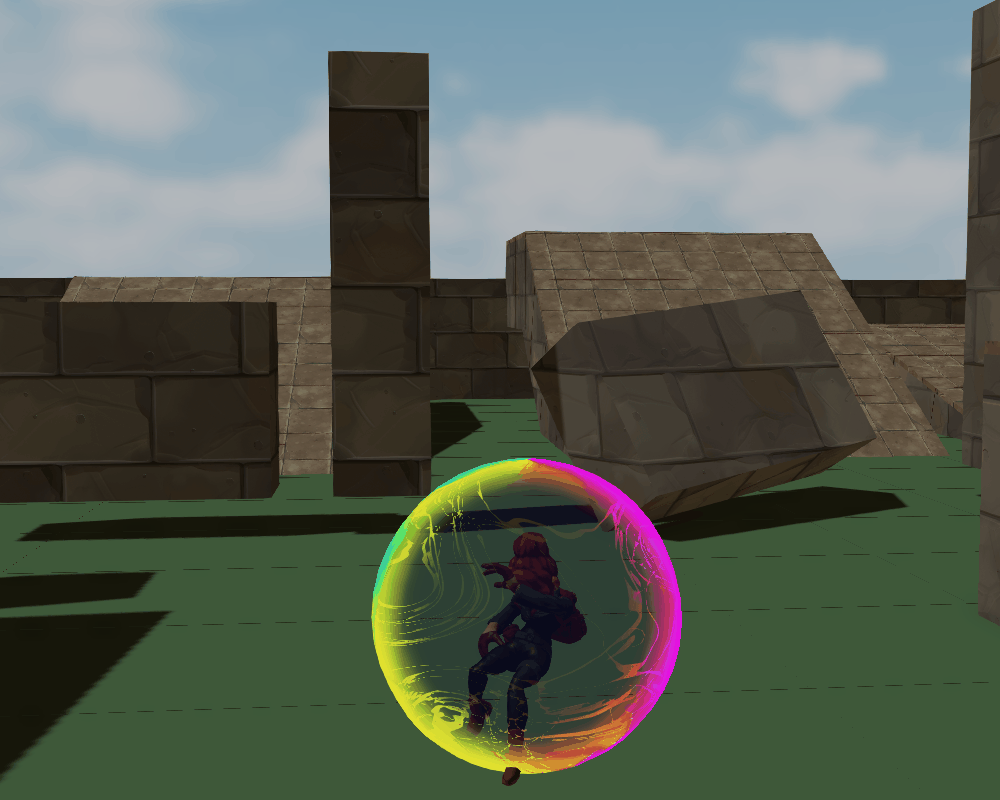 When the bubble pops there is a particle burst of smaller bubbles that I created and we can also see the dissolve part of the shader in action! This is controlled by a dissolve parameter that is changed by the programmers when the player jumps out of the bubble to make it disappaear and then reapper after a short while.
